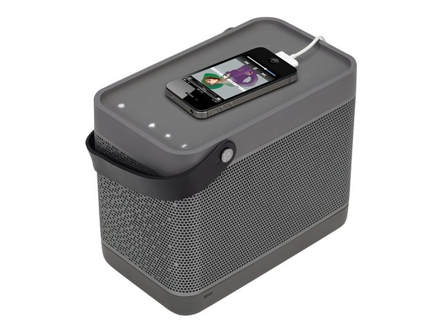 - Plays and charges iPhone or iPod through USB