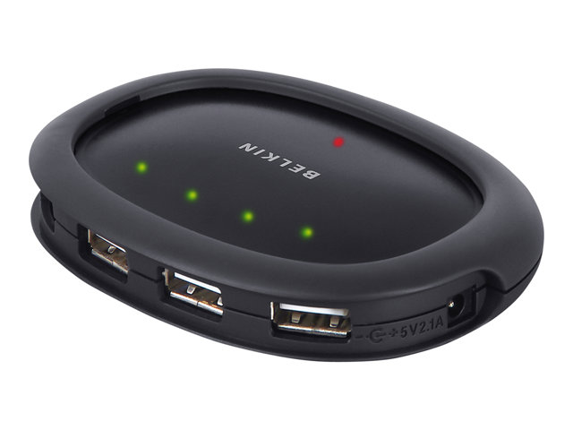 Belkin Hi-Speed USB 2.0 4-Port Hub provides four downstream USB ports that offer Plug-and-Play connectivity to your USB 1.1 (low- and full-speed) and USB 2.0 (high-speed) devices. This includes such peripherals as scanners, printers, mass-storage drives, and high-resolution cameras. The Hub is self-powered and allows cascading - so that up to 127 USB devices may be connected to a single port. The Hub is uniquely designed so that the four downstream ports can be positioned toward the back of the desktop for efficient cable management, or to the front of the desktop for easier port access. LEDs allow you to easily monitor master power and individual ports.